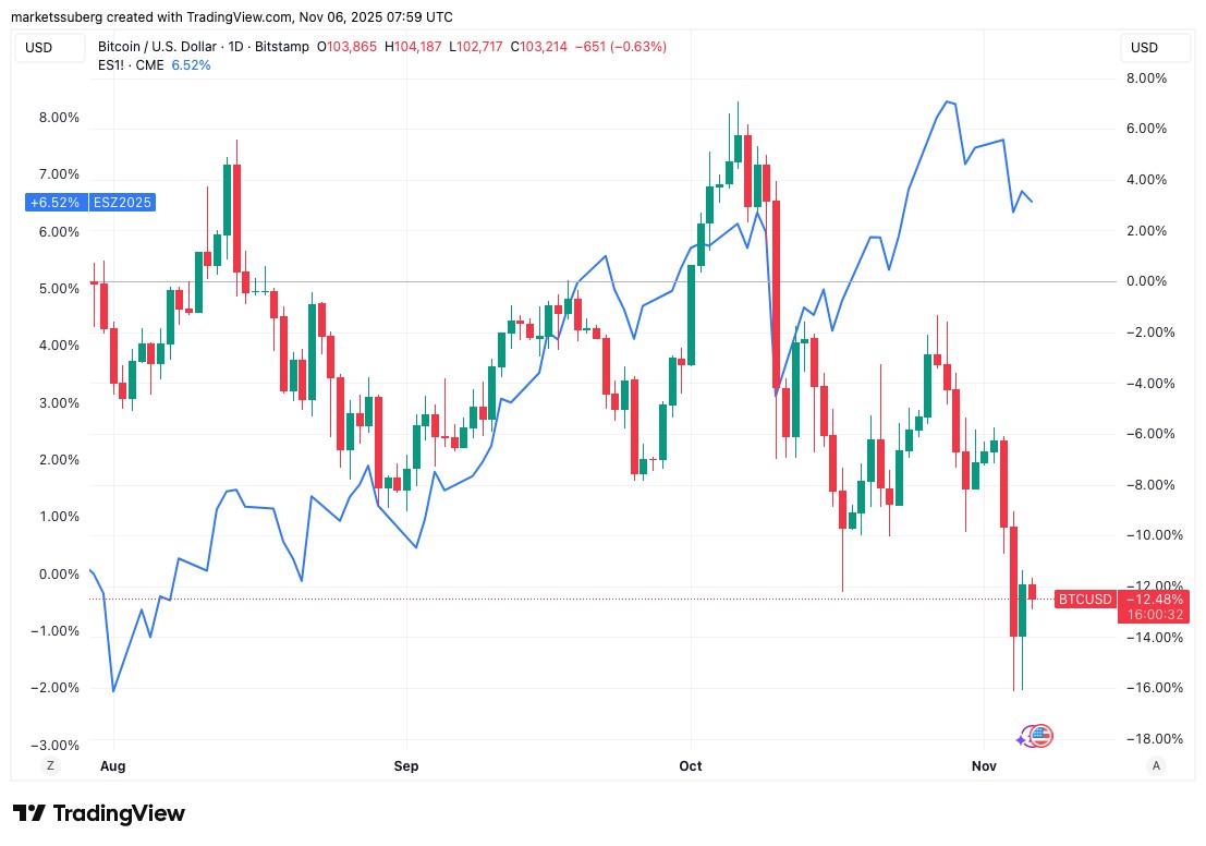 BTC/USD 与标普 500 期货一日走势图。来源:Cointelegraph/TradingView